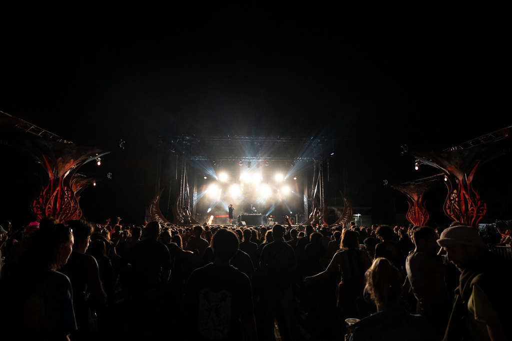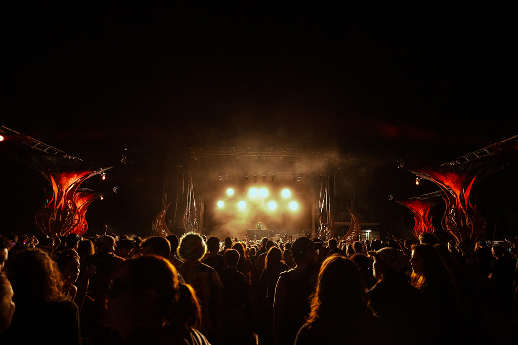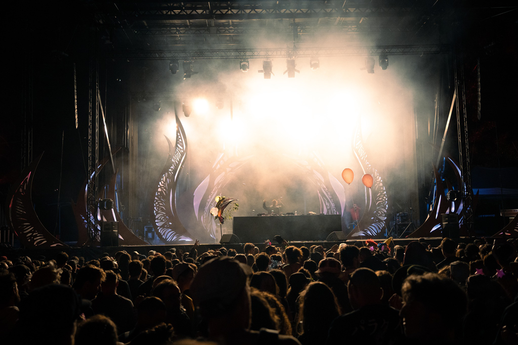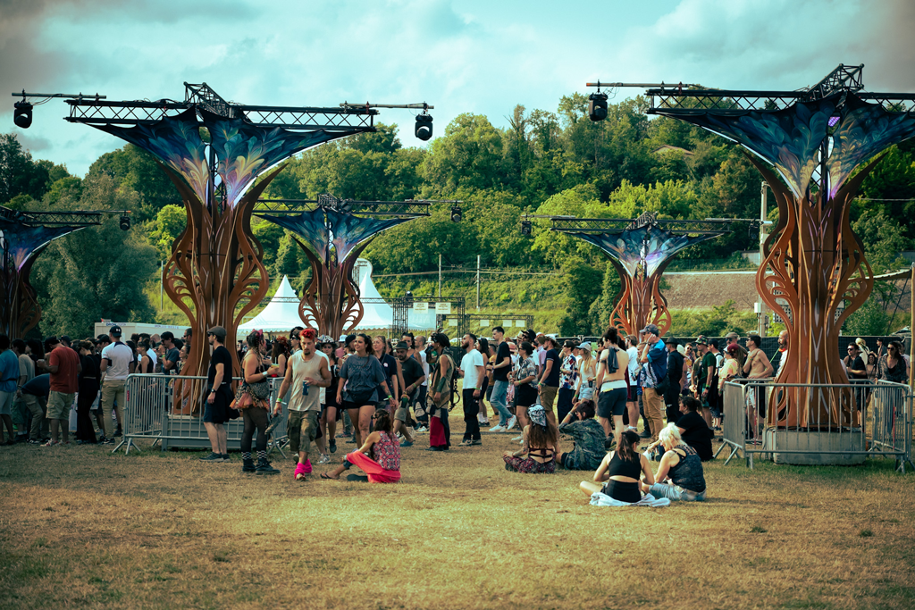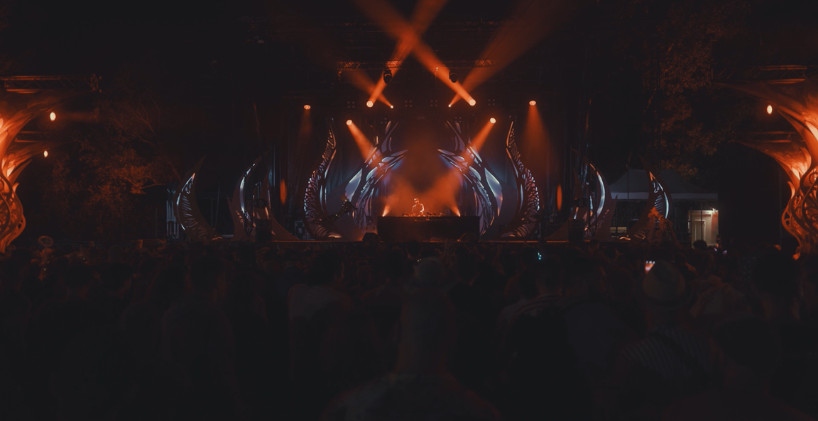 The stage scenography was conceived as a strong visual structure, framing the performance space and enhancing depth and immersion, as seen on the stage design. To extend the visual identity beyond the stage, we also created a series of psychedelic tree-shaped totems across the dancefloor, transforming the crowd area into an immersive environment.